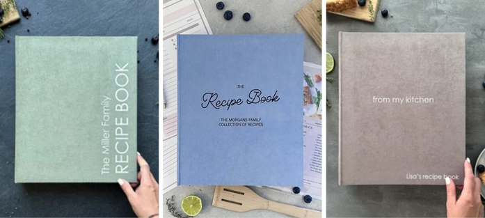 Book covers can match the colour scheme of your kitchen or living room. You can choose your own book covers from a palette of luxury fabrics in up to 31 colours.