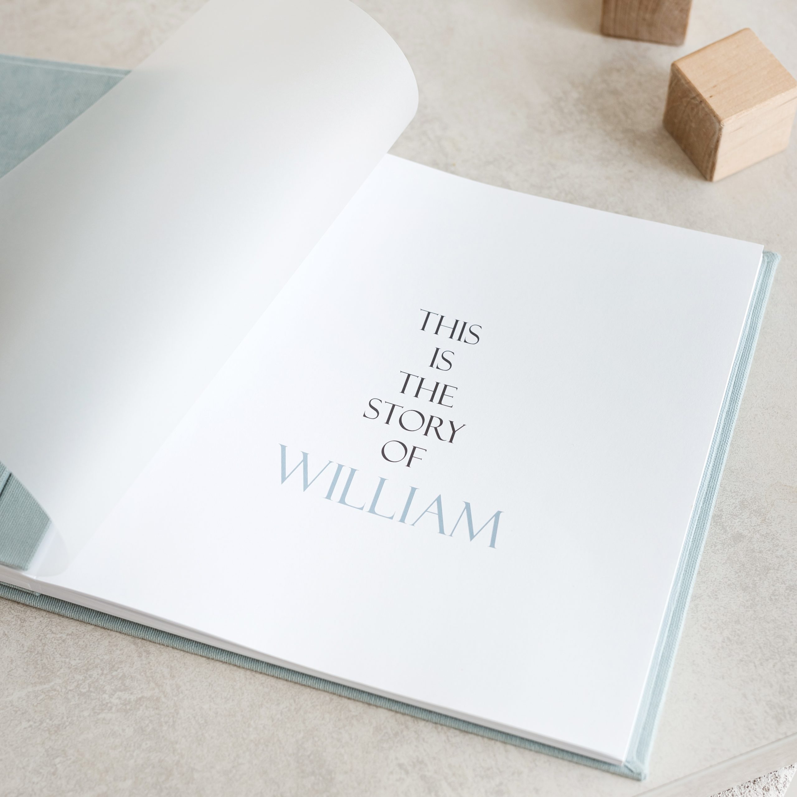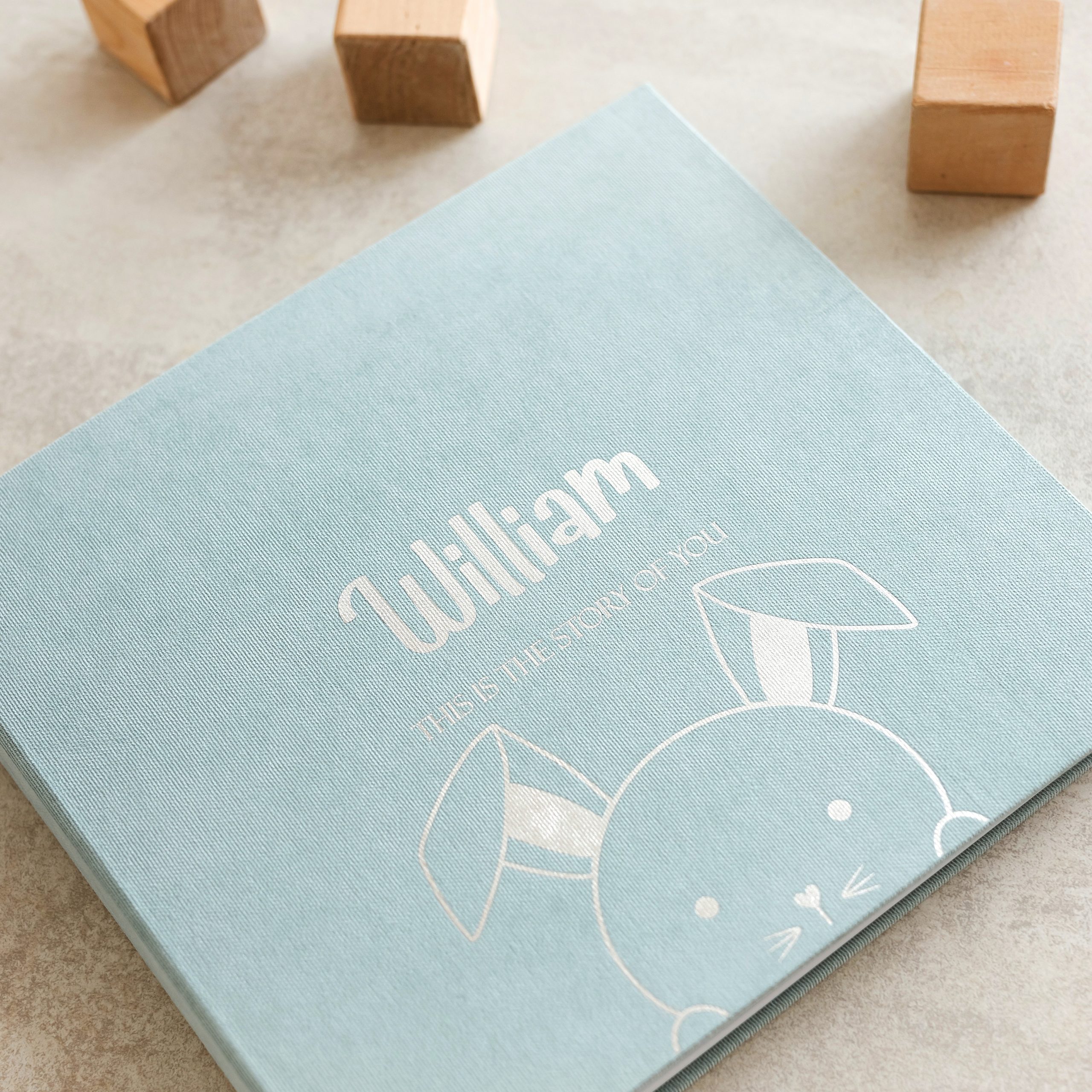 Minimalist baby memory book with fabric cover and customizable details.