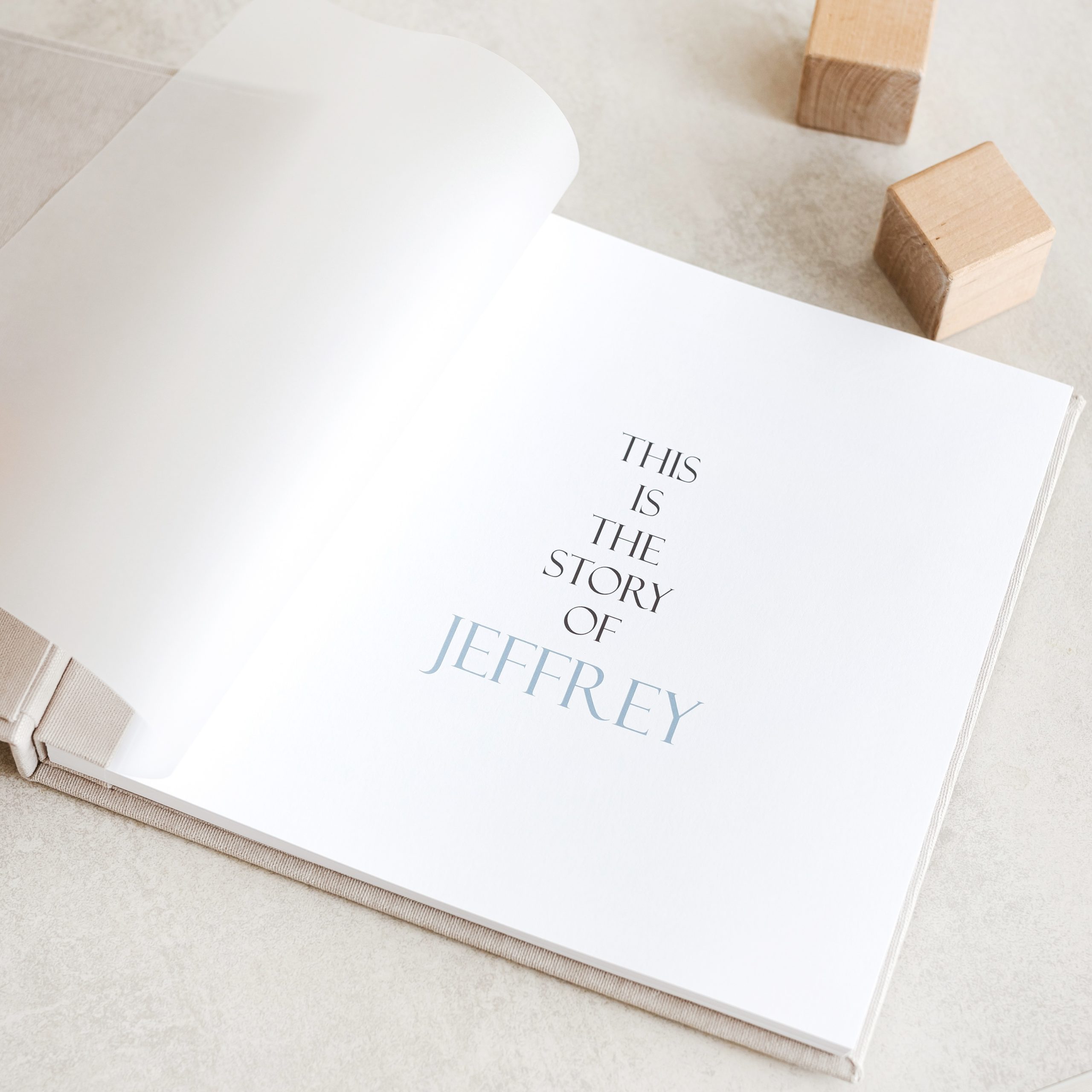 Minimalist baby memory book with fabric cover and customizable details.