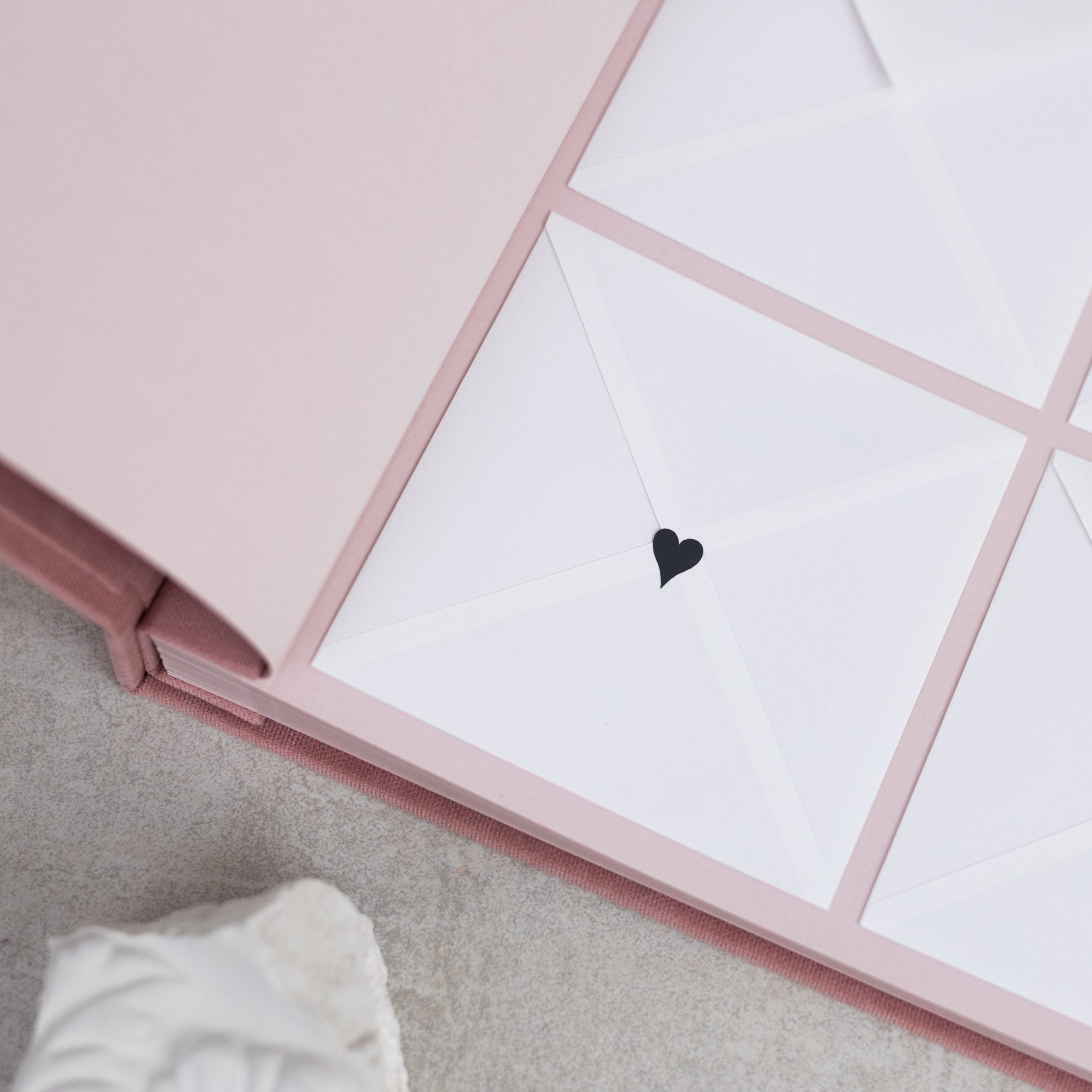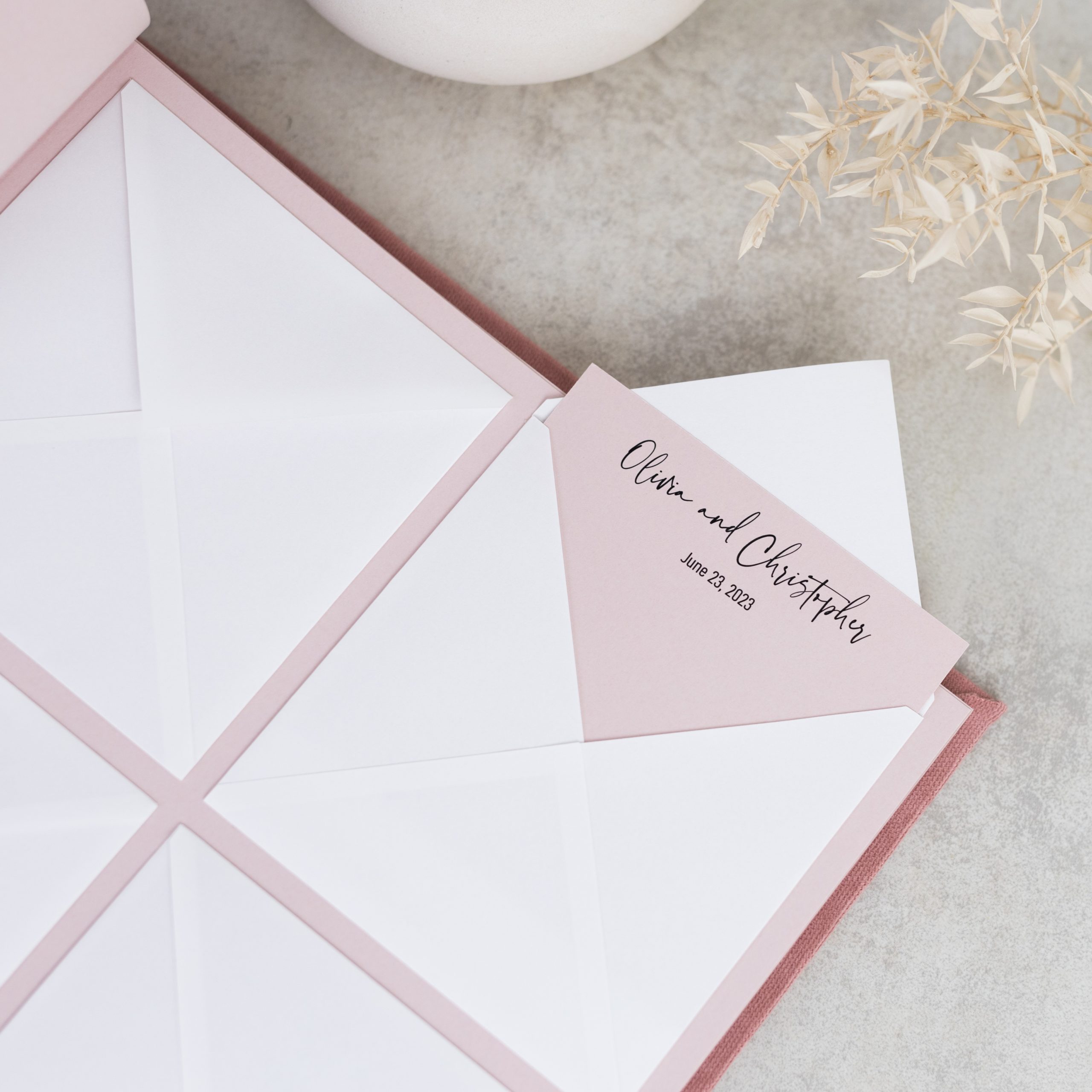 A minimalist guestbook with envelopes and personalised cards – a stylish way for guests to write their wishes. The handmade envelopes are designed to fit snapshots. So these books are also a great choice for those who will be using instant cameras at the party.