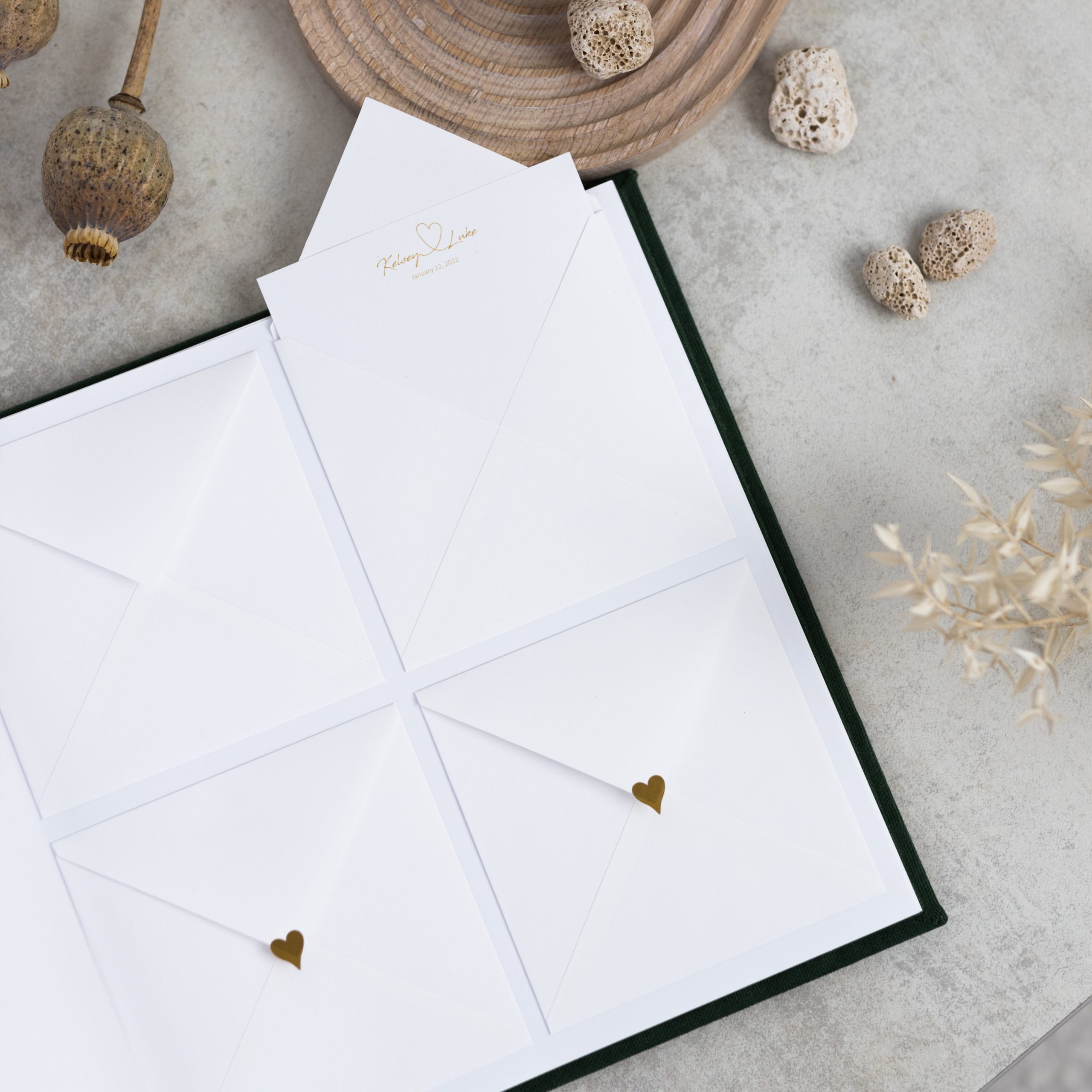 A minimalist guestbook with envelopes and personalised cards – a stylish way for guests to write their wishes. The handmade envelopes are designed to fit snapshots. So these books are also a great choice for those who will be using instant cameras at the party.