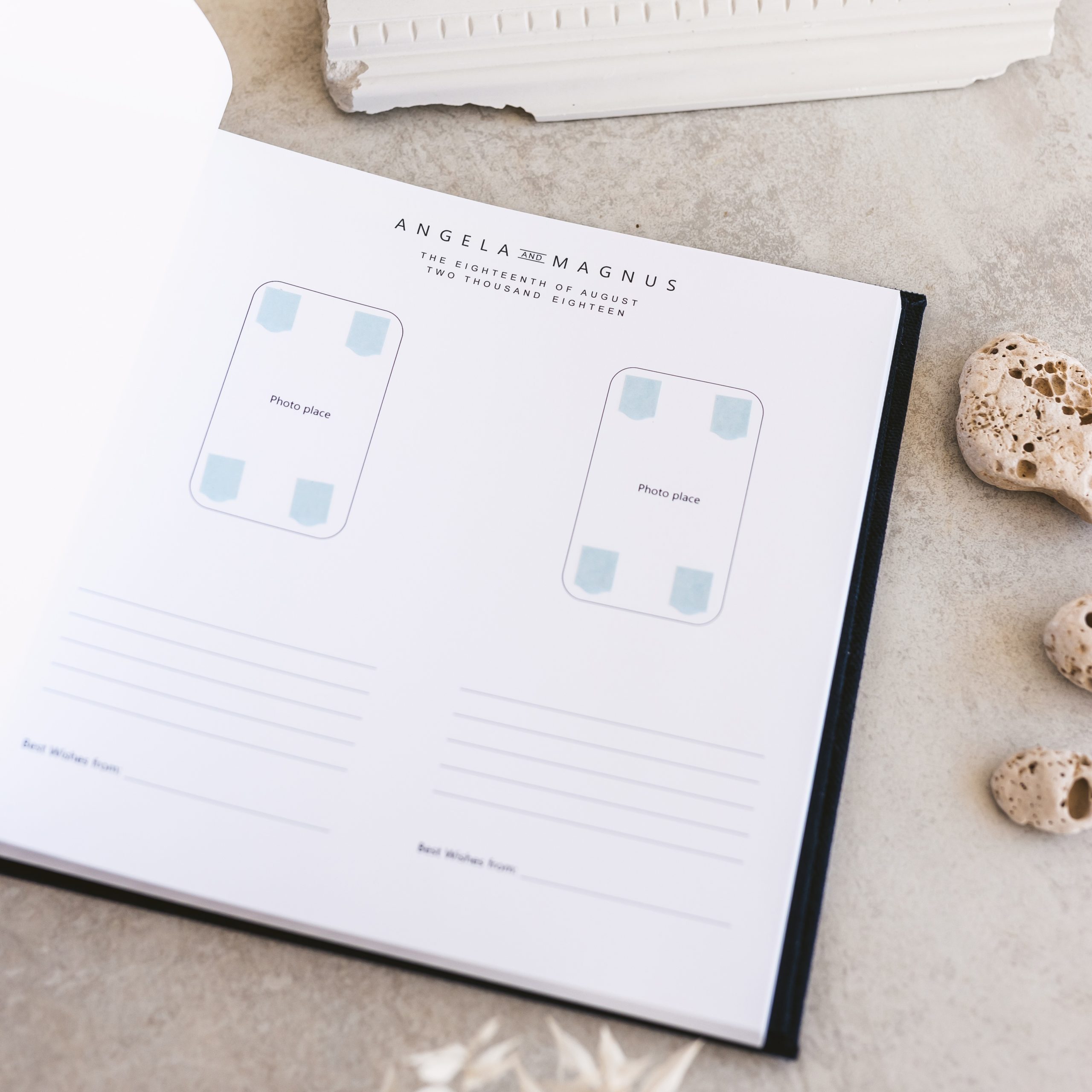 • Our photo guest books come with pre-added sticky corners on photo places, making it easier than ever to capture your special moments. Just stick your photos and sign!