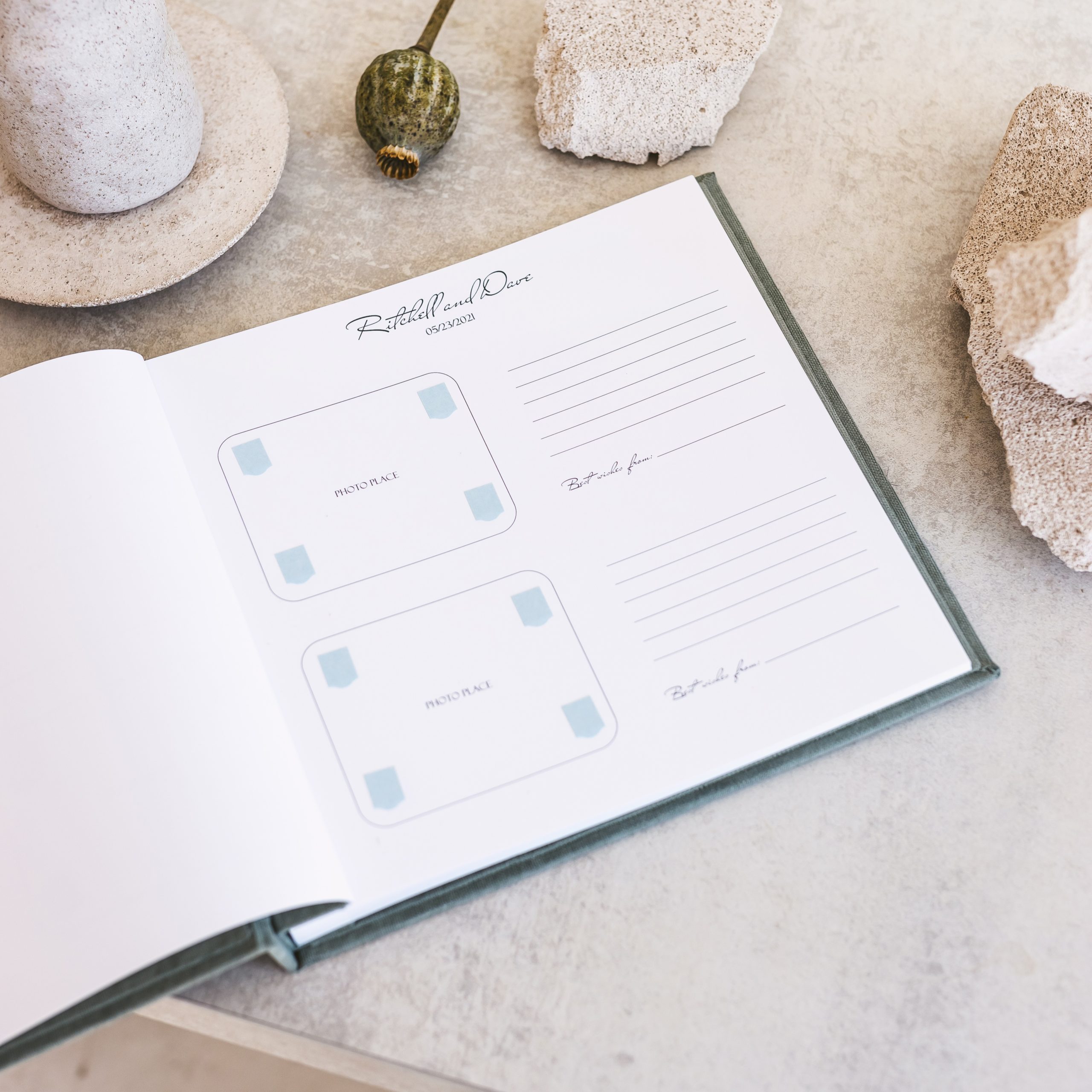 Our photo guest books come with pre-added sticky corners on photo places, making it easier than ever to capture your special moments. Just stick your photos and sign!