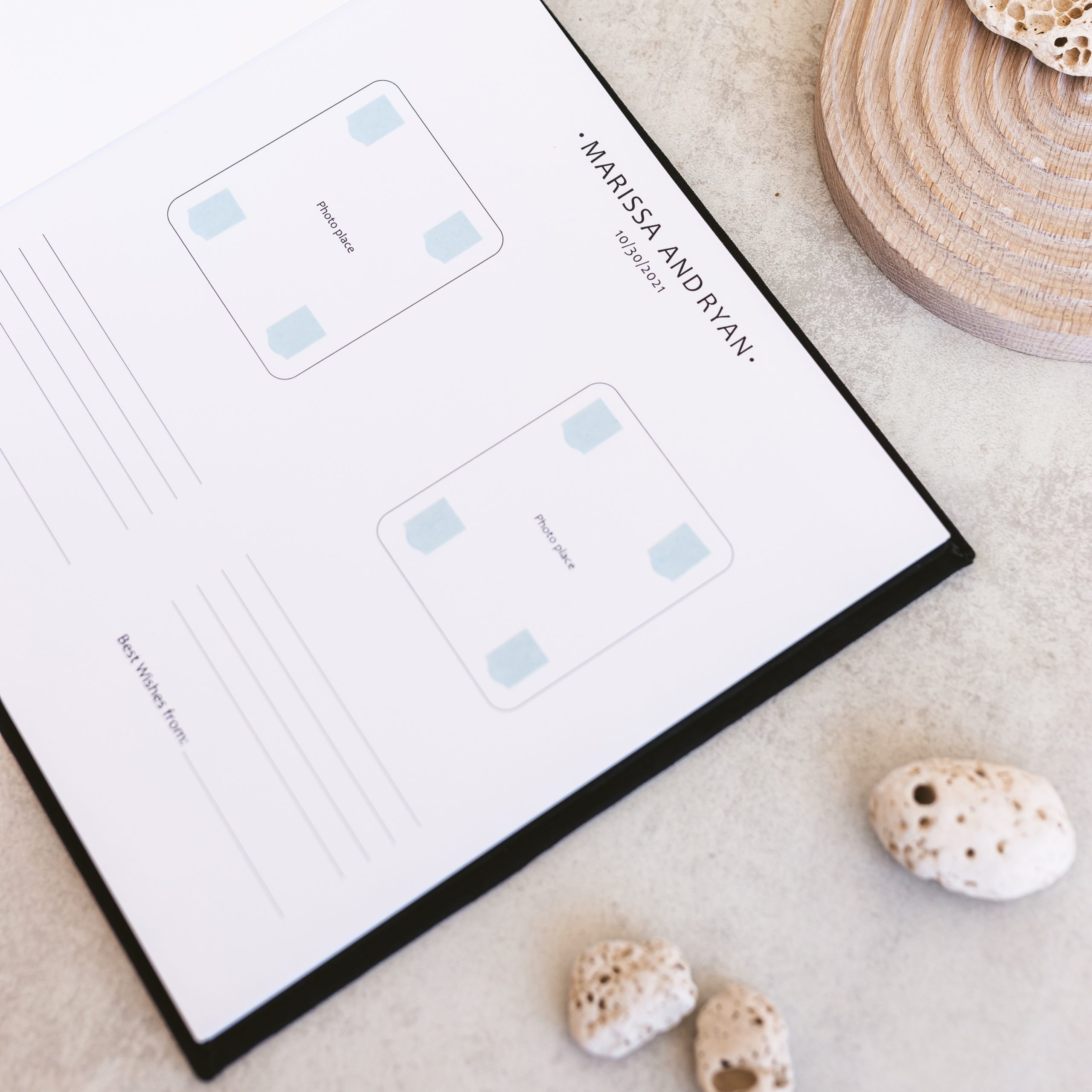• Our photo guest books come with pre-added sticky corners on photo places, making it easier than ever to capture your special moments. Just stick your photos and sign!