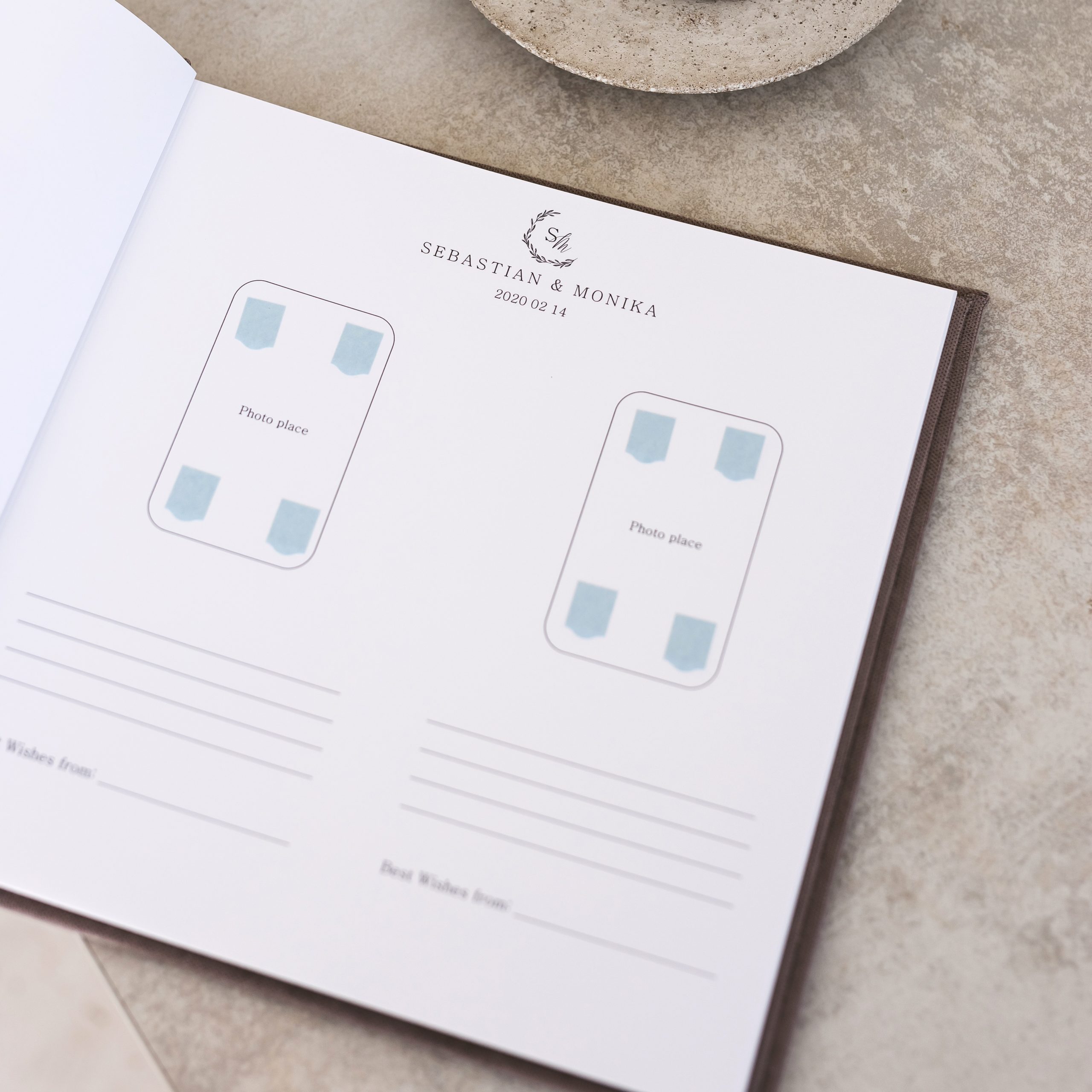 • Our photo guest books come with pre-added sticky corners on photo places, making it easier than ever to capture your special moments. Just stick your photos and sign!