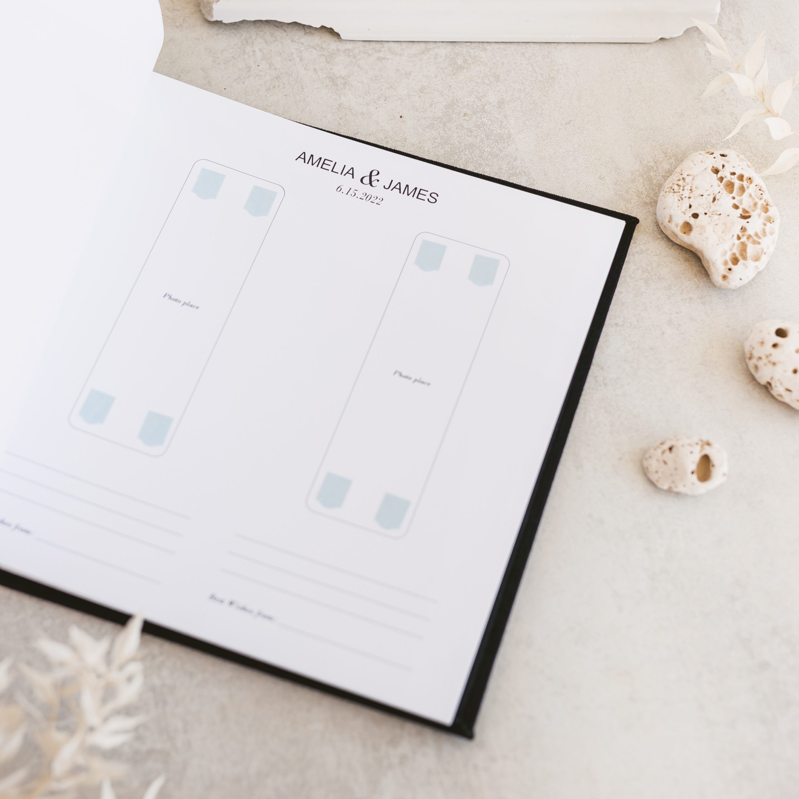 Our photo guest books come with pre-added sticky corners on photo places, making it easier than ever to capture your special moments. Just stick your photos and sign!