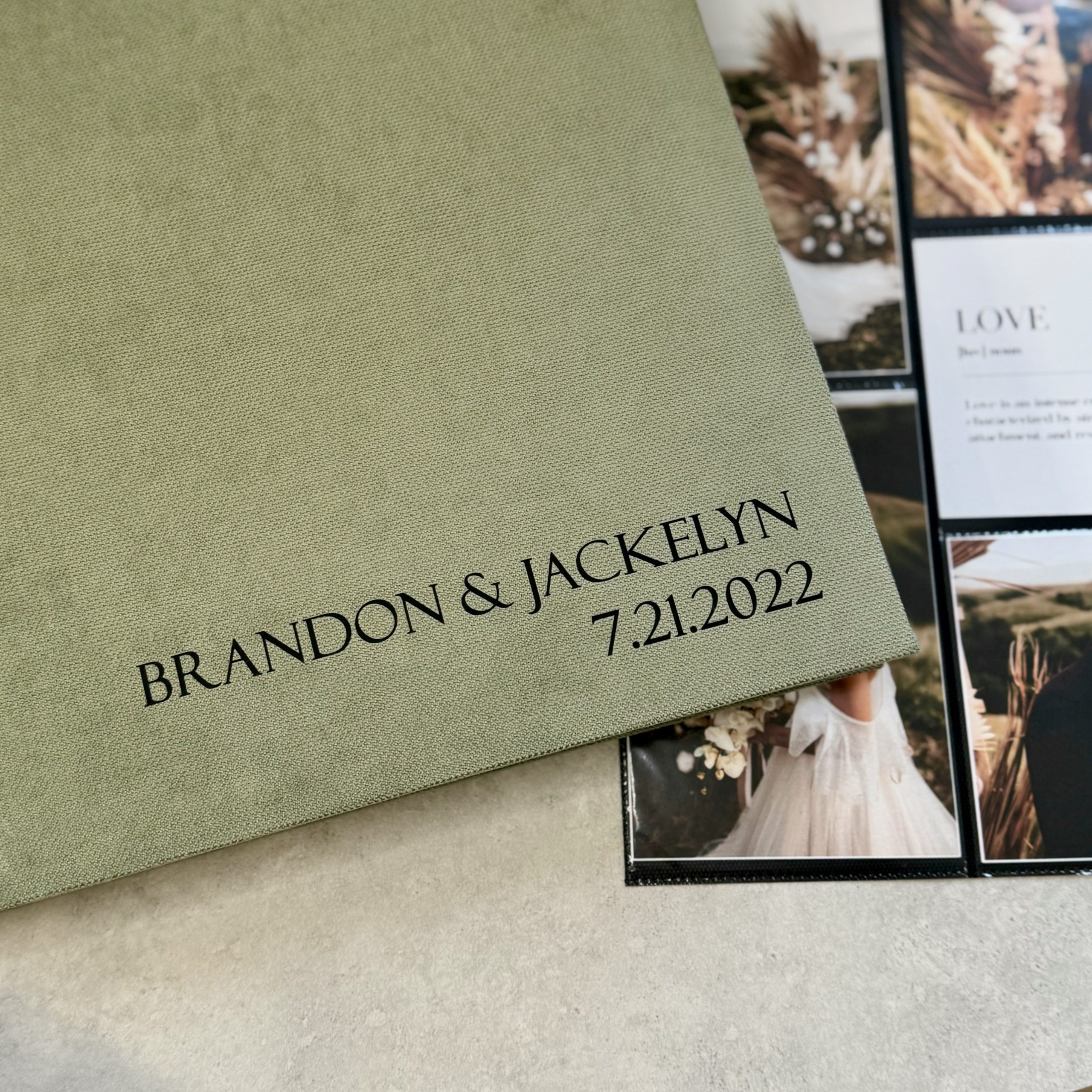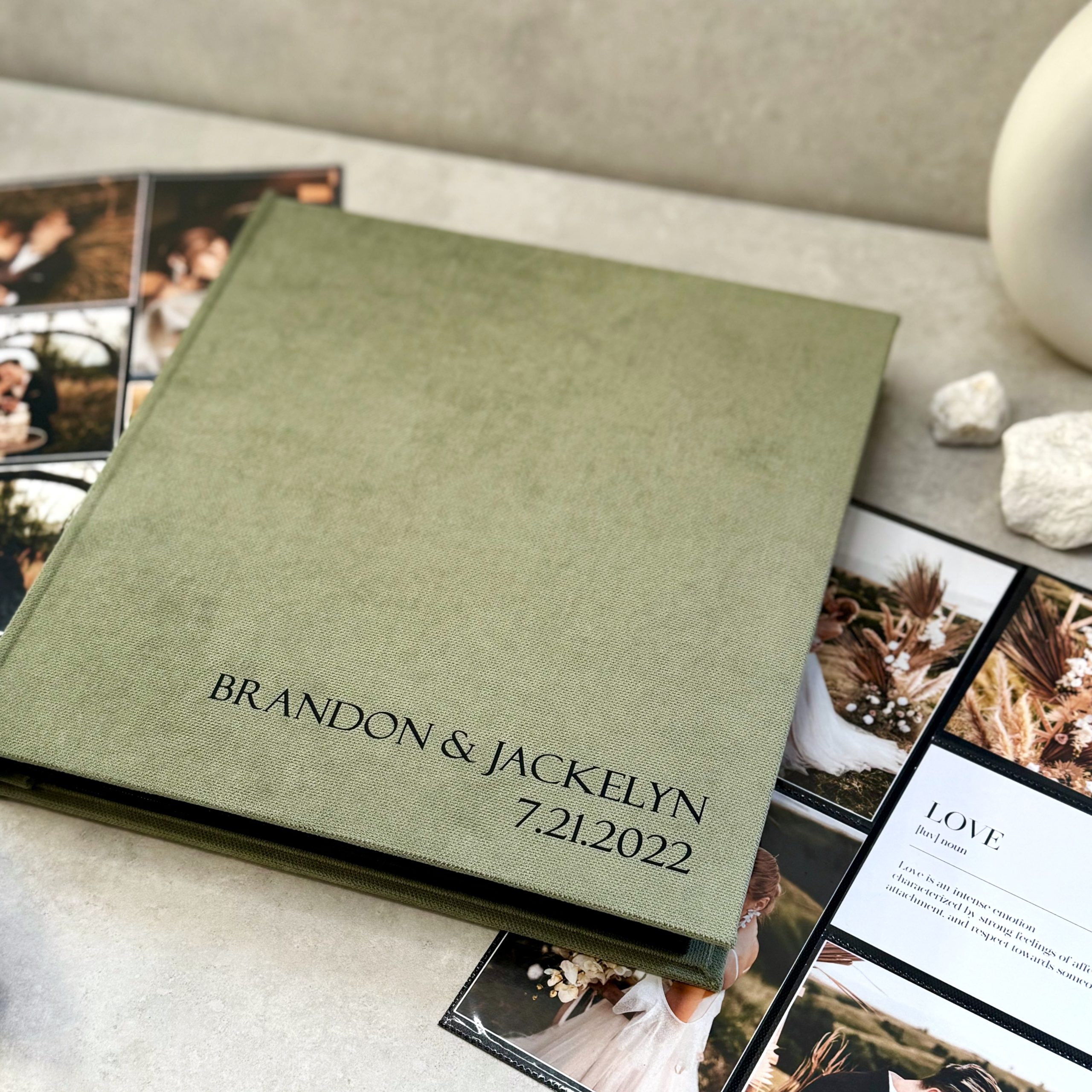 • Personalization: we create each album to order and tailor it to your vision. Choose your color, design, and add names, special dates, a meaningful phrase – or even your logo. Just make sure to send us a vector file by email: info@vestuviuatributika.lt.