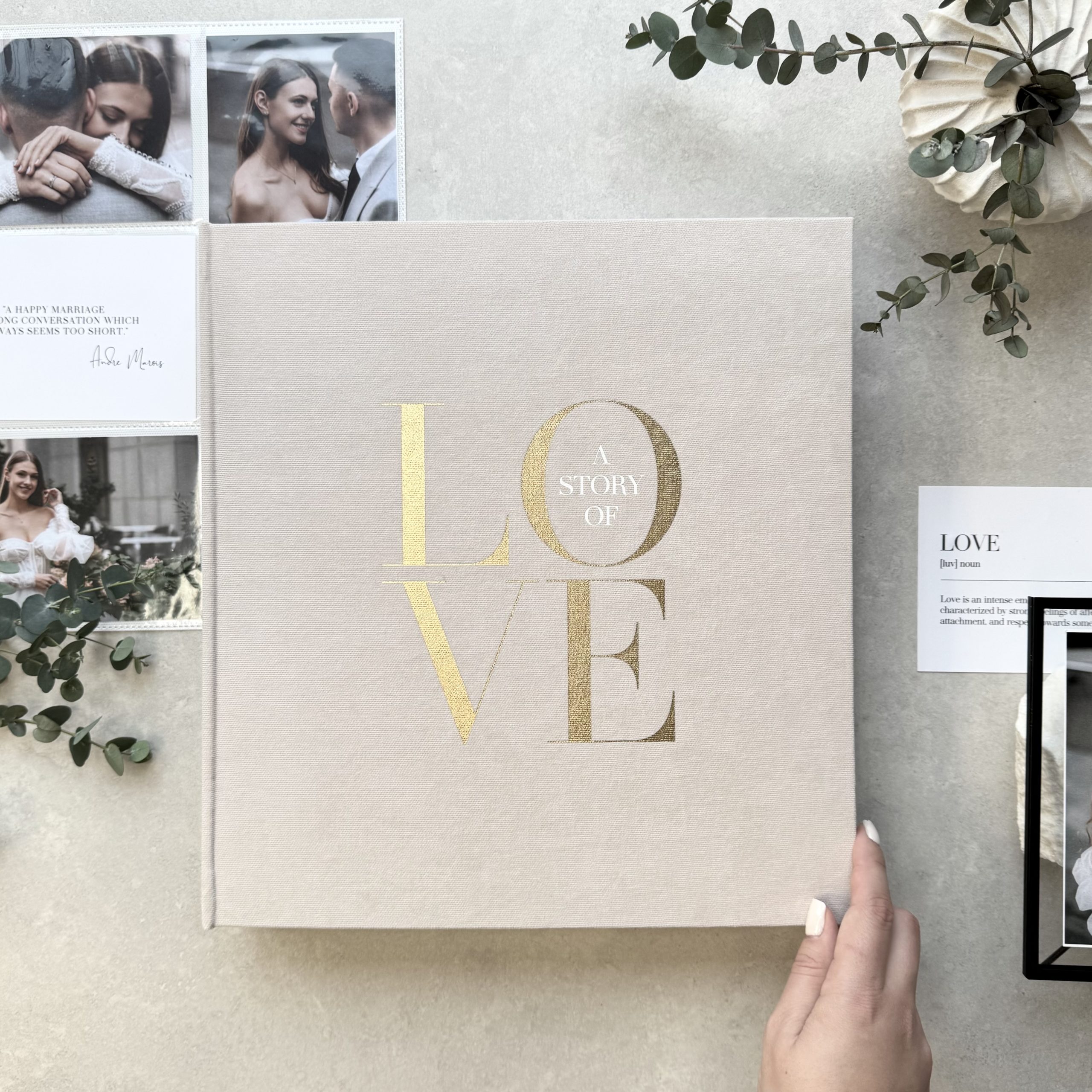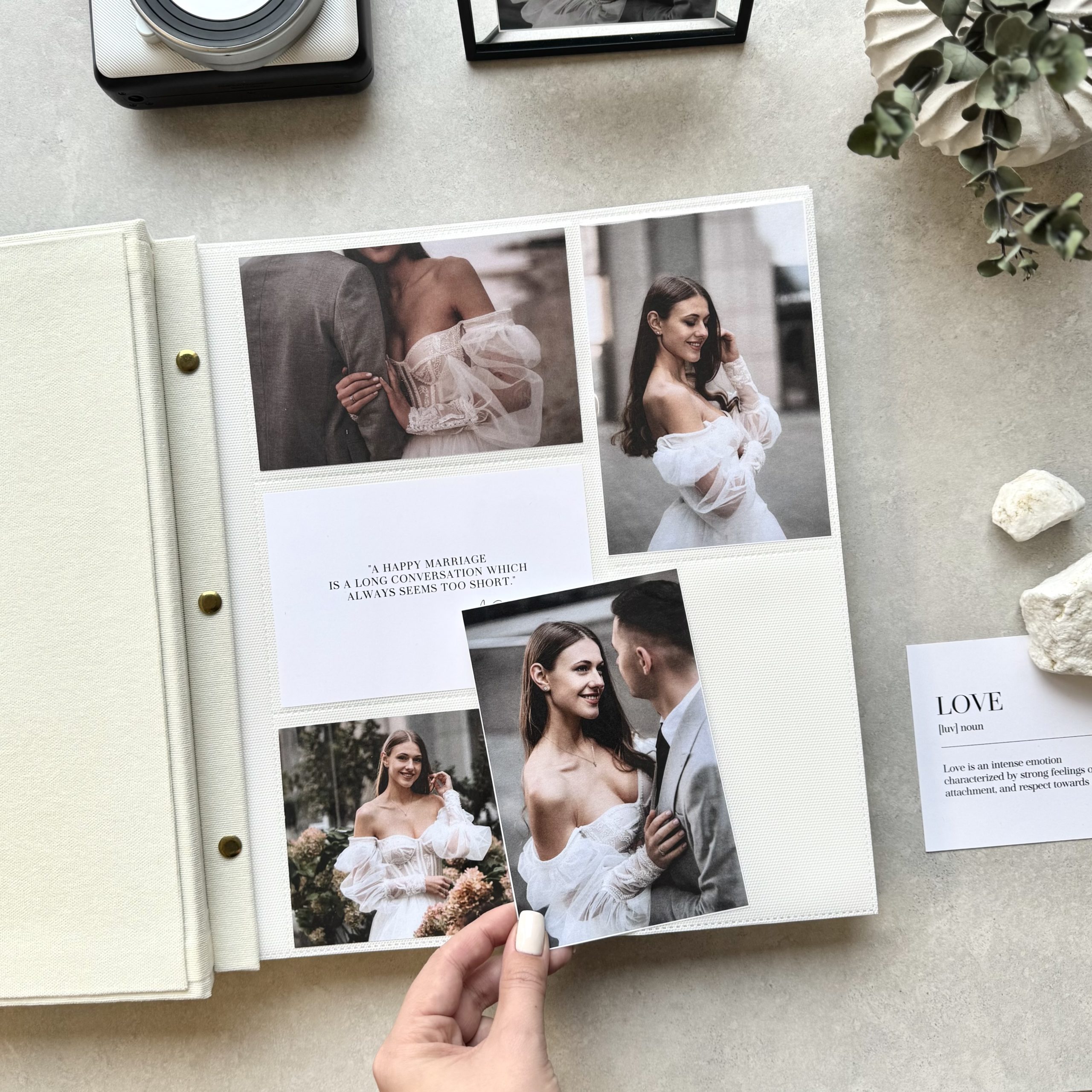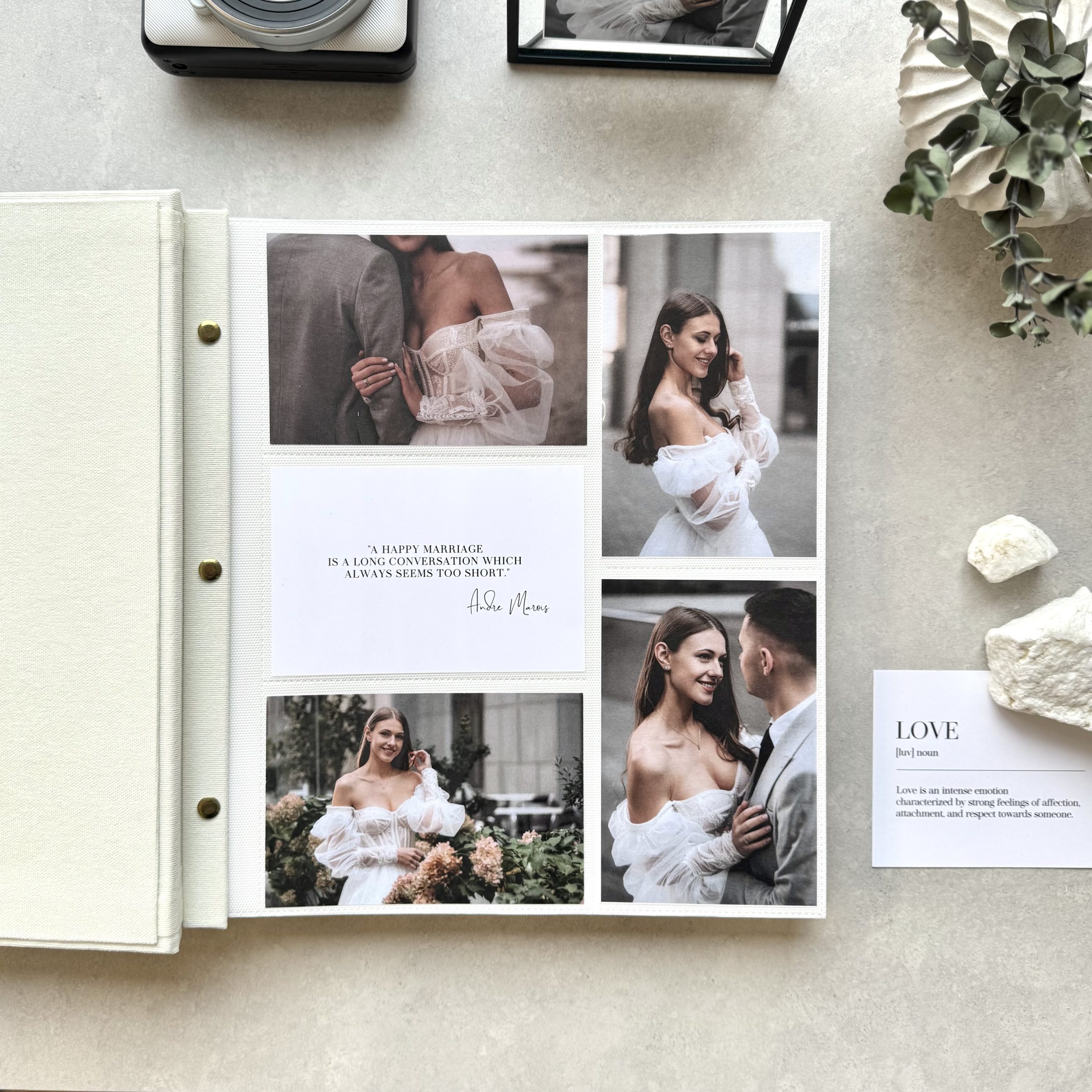 - Personalization: we create each album to order and tailor it to your vision. Choose your color, design, and add names, special dates, a meaningful phrase — or even your logo. Just make sure to send us a vector file by email: info@vestuviuatributika.lt.